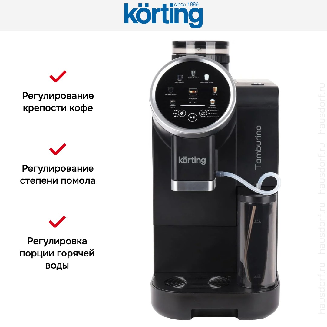 Кофемашина Korting KACM 2028 N Tamburino — стильный прибор для тех, кто ценит вкус и удобство. Аппарат сочетает строгий черный цвет с элементами нержавеющей стали, что делает его универсальным для любой обстановки. Компактные габариты 44×19×41 см и вес 8.7 кг позволяют разместить устройство даже на узкой рабочей поверхности. Сенсорные переключатели и информативный дисплей гармонично вписаны в панель управления, а мягкая подсветка индикаторов подсказывает текущее состояние системы.