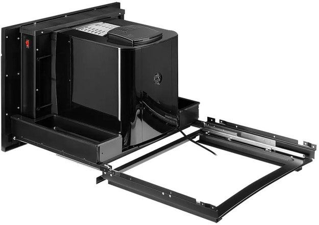 Телескопические направляющие в современных встраиваемых кофемашинах предназначаются для плавного, бесшумного и безопасного выдвижения устройства из ниши. У многих моделей емкости для кофейных зерен, молотого кофе и воды располагаются за фасадом прибора. В случае, если все эти контейнеры не являются съемными, телескопические направляющие позволяют быстро и без особых усилий выдвинуть всю конструкцию и зафиксировать ее в полностью выдвинутом положении, чтобы засыпать зерна или порошок кофе и залить воду. Там же, за фасадом, может находиться полочка для хранения и подогрева чашек.