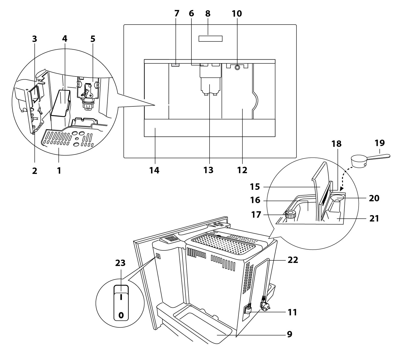 Контейнер для кофейных зерен — принадлежность кофемашин, оборудованных кофейной мельницей. Как правило, над мельницей он и располагается для более удобного помола кофе. Подобные контейнеры изготавливаются из безопасного пластика, прозрачного или непрозрачного, и бывают съемными и несъемными. Они оснащаются специальными датчиками, которые анализируют количество кофе, для оповещения о том, что контейнер скоро опустеет. Доступ к контейнеру для зерен зависит от типа встраивания кофемашины. Так, во встроенных машинах требуется вдвинуть прибор на телескопических направляющих.
