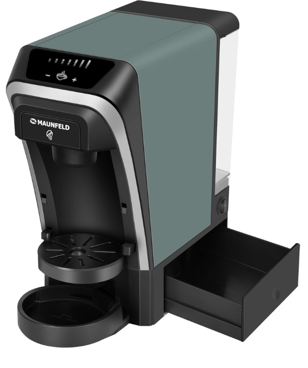 Визуальные характеристики кофемашины играют важную роль при выборе. Цвет корпуса этой модели — зеленый. Основной материал поверхности — пластик.