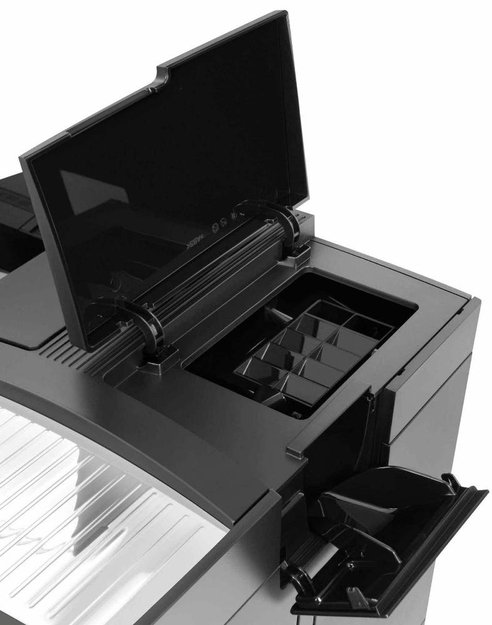 Удобная панель управления расположена в верхней фронтальной части и содержит кнопки и поворотные регуляторы. Такая комбинированная система понятна людям разного возраста. На символьном дисплее отображаются индикаторы уровня воды и кофе, необходимости очистки от накипи и другие. Вы можете программировать рецепты, выставлять время автоматического выключения прибора.