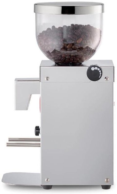 Корпус прибора выполнен из хромированной нержавеющей стали — это не только крепкий, но и эффектный материал. Такая кофемолка будет замечательно смотреться в паре с машинкой в похожем дизайне или на контрасте с цветными вариантами.