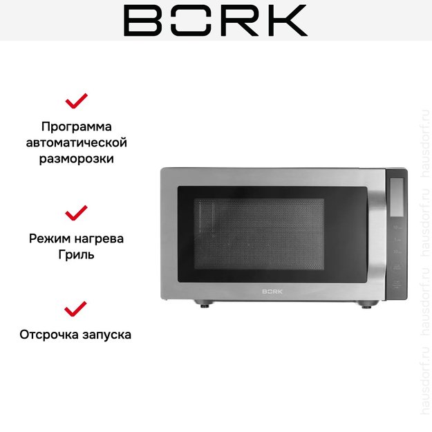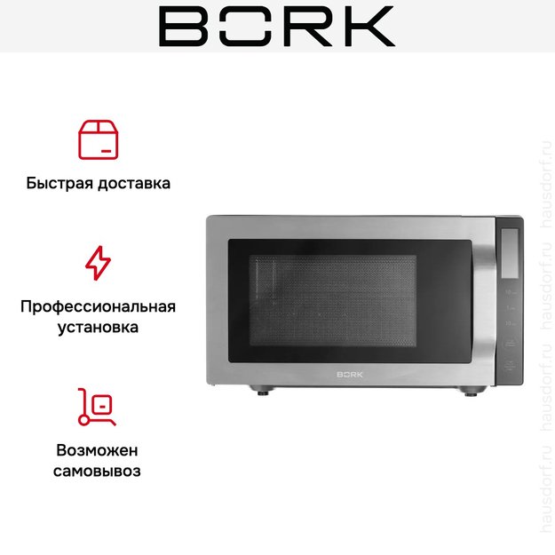 Микроволновая печь BORK W503 — отдельно стоящая модель объемом 25 литров в корпусе из нержавеющей стали. Максимальная мощность микроволн составляет 1400 Вт, при этом доступно приготовление на пяти уровнях мощности. Модель работает без поворотного стола, керамическое основание равномерно распределяет тепловое воздействие по всему объему.