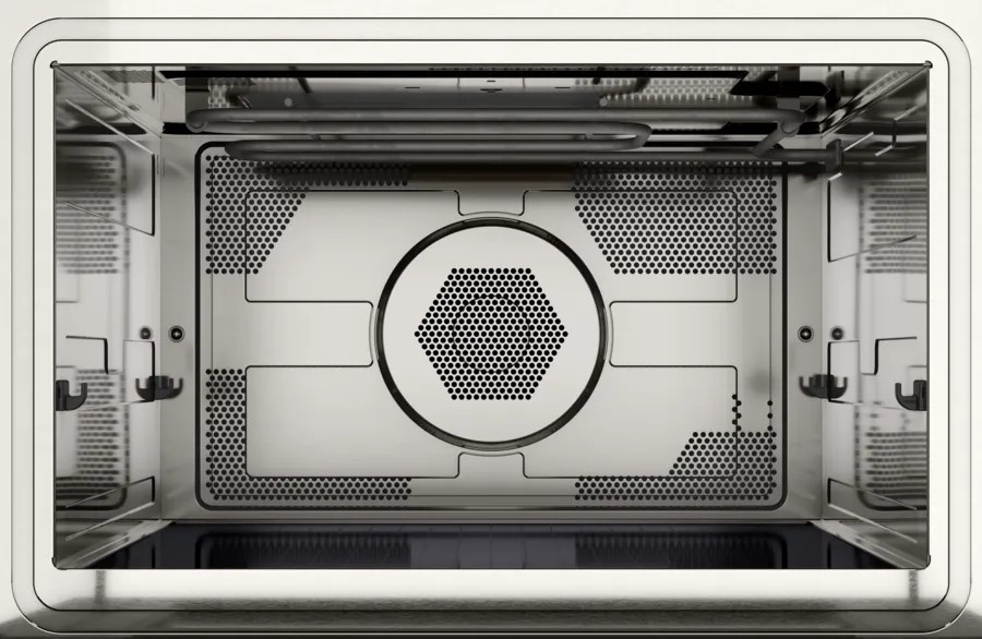 Вентилятор на задней стенке забирает воздух из комнаты, прогоняет его через магнетрон и нагнетает в камеру. Через вентиляционные отверстия поток выходит обратно во внешнюю среду. Таким образом охлаждается и корпус, и магнетрон. Это позволяет сохранить качество работы и защитить от перегрева мебель.