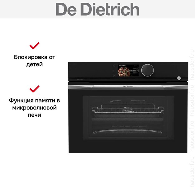 Количество режимов в данной модели Де Дитрих: 10 шт. Для обработки продуктов и готовых блюд используются следующие виды нагрева: Микроволны, Гриль, Гриль + конвекция (обдув), Обдув горячим воздухом (конвекция), Микроволны + гриль, Микроволны + конвекция (обдув). Выберите гриль, чтобы получить поджаристую корочку на мясе или рыбе. Конвекция способствует равномерную распространению горячего воздуха по всей камере, поэтому даже если блюдо большое, все его кусочки пропекаются одинаково. Отдельная опция для размораживания продуктов и полуфабрикатов облегчает жизнь — не нужно самостоятельно настраивать параметры. Автоматические программы для приготовления добавлены производителем также для упрощения работы.
