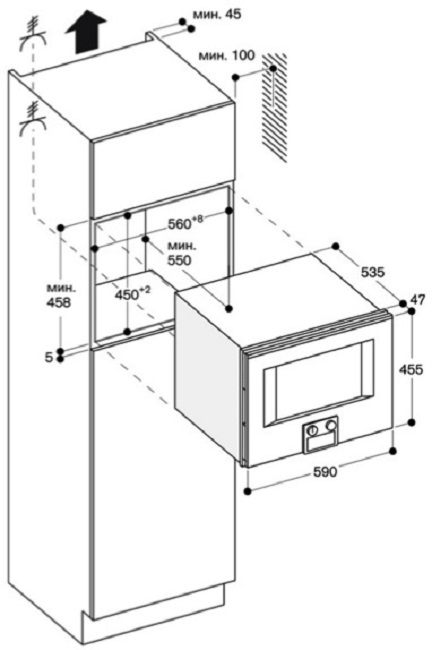 Высота микроволновой печи, то есть расстояние от основания до крышки прибора, определяется прежде всего типом встраивания. Отдельно стоящие модели — как соло, так и оснащенные грилем или конвекцией, — с камерой объемом от 15 до 30 литров, имеют высоту около 30 см. Такие микроволновки удобно размещаются на столе; при необходимости их можно убрать на полку или в шкаф. Встраиваемые в стандартную кухонную колонну или тумбу многофункциональные микроволновые печи имеют ту же высоту, что и другая встроенная техника: для компактных приборов она составляет 45 см, а для полноразмерных — порядка 60 см.
