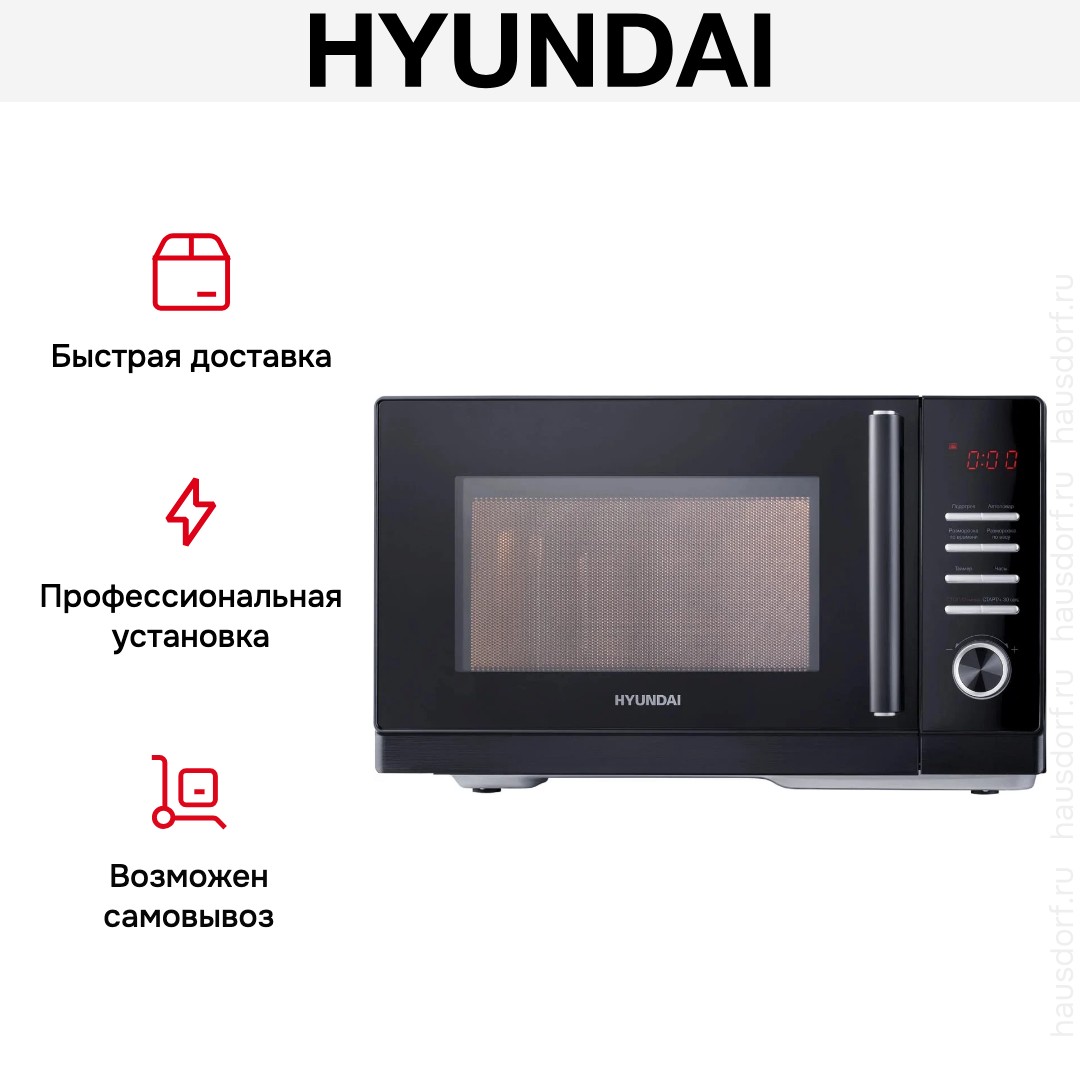 Микроволновая печь Hyundai HYM-D3013. Внешний облик сочетает строгий чёрный корпус с серебристыми акцентами, что делает прибор аккуратным и универсальным для любой кухни. Небольшие габариты 28×46.9×37.7 см и вес 11.7 кг позволяют легко разместить прибор на столешнице или в нише шкафа, не перегружая пространство. Навесная дверца с удобной ручкой и левым упором обеспечивает простоту доступа к камере, а LED-панель спереди добавляет современной технологичности облику.
