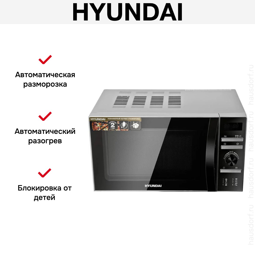 Микроволновая печь Hyundai HYM-D3026 сочетает компактный серебристый корпус с черно-серебристой фурнитурой и продуманной эргономикой. Объем камеры 20 литров и диаметр стеклянного блюда 24,5 см делают устройство удобным решением для небольшой семьи или офиса. Габариты 25,7×45,1×33,6 см обеспечивают размещение на любой кухонной столешнице, а вес 10,1 кг упрощает перестановку при необходимости. Дверца с ручкой и левым упором открывается плавно, а внутреннее освещение помогает контролировать процесс приготовления без лишних движений.