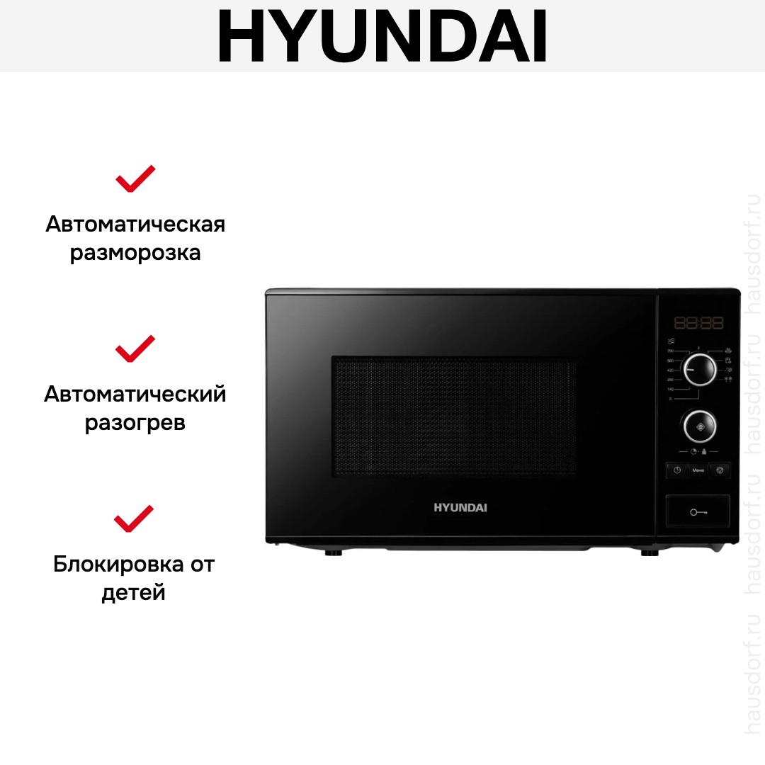 Микроволновая печь Hyundai HYМ-D3032 представляет собой компактный и стильный прибор в черном корпусе с аккуратной серебристой отделкой элементов фурнитуры. Корпус занимает минимум места на кухонной поверхности благодаря габаритам 26.2×45.2×33.4 см, а объем рабочей камеры 20 литров делает устройство подходящим для небольших семей и одиночных пользователей. Навесная дверца с кнопкой открывания и левым дверным упором работает плавно и удобно, а внутренняя эмалевая поверхность облегчает уход: достаточно протереть мягкой губкой без агрессивных средств. Встроенная подсветка позволяет контролировать процесс приготовления, а вращающееся стеклянное блюдо диаметром 24.5 см обеспечивает равномерный прогрев и помещает стандартную тарелку.