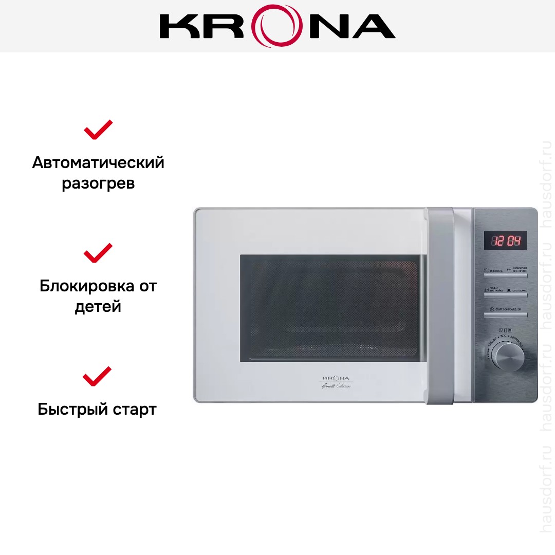 Микроволновая печь KRONA QUANTUM 44 WH/IX цвета нержавеющей стали/белый удачно впишется в любую кухню и прекрасно дополнит остальную кухонную технику. Для удобства использования печь оснащена электронным таймером, который рассчитан максимум на 95 минут, вам не придется постоянно смотреть на часы, а подсветка камеры упростит визуальный контроль над приготовлением блюд. Открывание происходит при помощи выносной ручки, которая обеспечивает удобный хват. Благодаря такой конструкции сводится к минимуму контакт с фасадом, что делает устройство практичным вариантом. Функция разморозки по времени и весу значительно сэкономит время на оттаивание продуктов, а 8 рецептов автоприготовления избавит от выставления многочисленных параметров. Эмаль легкой очистки EASY CLEAN —современное покрытие внутренней камеры печи, которое отталкивает жир, защищает поверхность и облегчает её чистку.