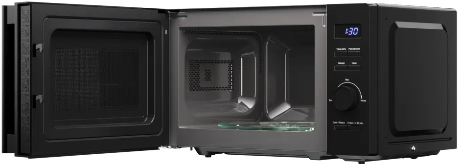 Материал внутренней поверхности — эмаль. Это самое распространенное покрытие, так как оно зарекомендовало себя высоким качеством, устойчивостью к механическим воздействиям и простотой ухода. Полезный объем для готовки — 20 л. Для установки и прогрева посуды используется классическое вращающееся блюдо. Понятное электронное управление не вызовет трудностей ни у кого из вашей семьи. Для изменения настроек или выбора программ используются следующие переключатели: кнопочные.