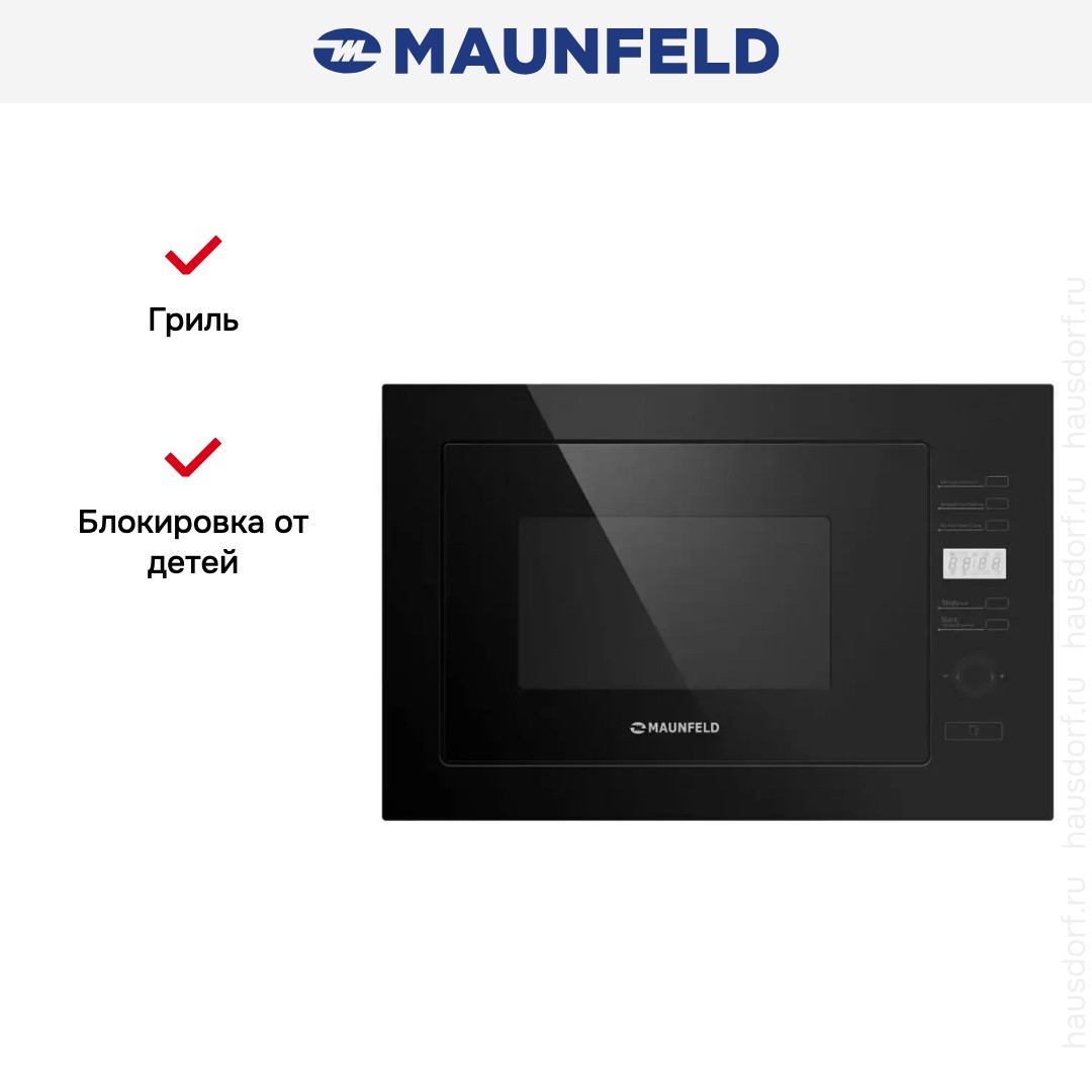 Maunfeld MBMO.25.7GB — встраиваемая микроволновая печь с черным стеклянным фронтом. Модель снабжена мощным кварцевым грилем, который в отличие от устаревшего ТЭНа быстрее нагревается, имеет более высокую рабочую температуру и не требует специальной чистки. Для управления функционалом прибора предусмотрена сенсорная панель c электронным дисплеем. Кнопки отличает хорошая чувствительность и быстрая реакция на команду пользователя. Каждый элемент имеет обозначение, поэтому не будет проблем с настройкой параметров.