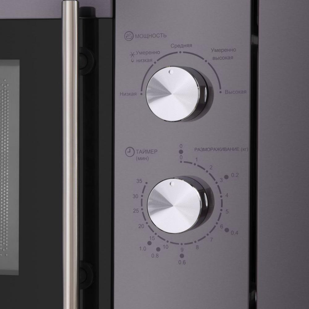 Материал внутренней поверхности — нержавеющая сталь. Благодаря ей хорошо аккумулируется и поддерживается тепло, прибор долго служит без повреждений. Полезный объем для готовки — 20 л. Для установки и прогрева посуды используется классическое вращающееся блюдо. В комплекте также есть решетка, с помощью которой можно разнообразить привычное меню. Стандартное механическое управление не вызовет трудностей ни у кого из вашей семьи. Для изменения настроек или выбора программ используются следующие переключатели: поворотные.