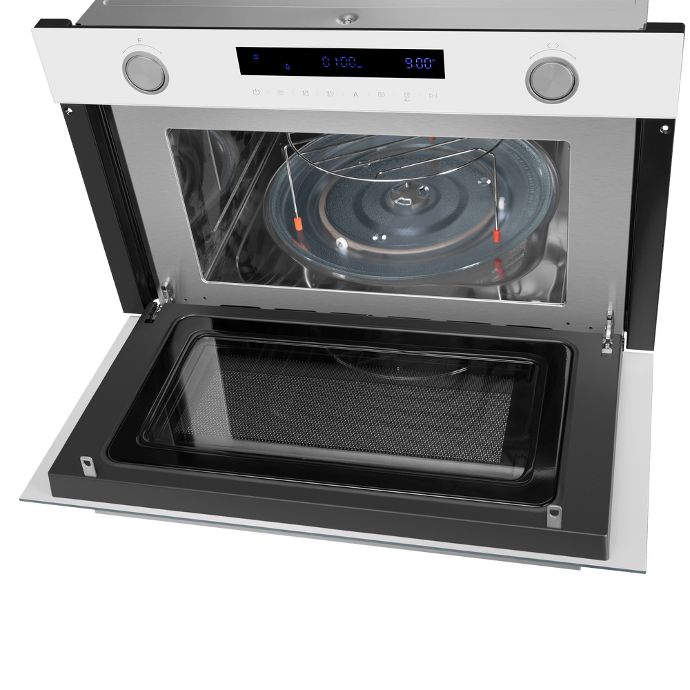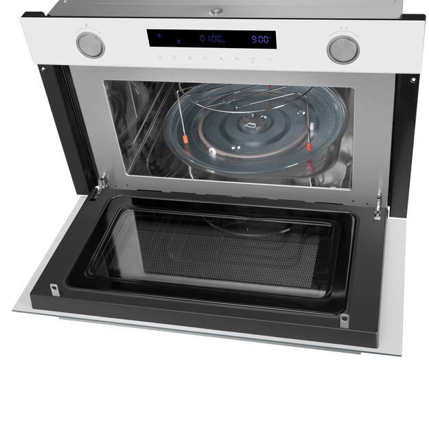 Конвекционный вентилятор устанавливается в микроволновках без поворотного стола: равномерное распределение горячего воздуха позволяет размещать в камере сразу несколько блюд. Комбинация вентилятора и верхнего гриля называется турбогрилем: этот режим очень хорош для выпечки больших пирогов и кексов. Сочетание гриля и конвекции подойдет и для приготовления больших кусков мяса или целой птицы и рыбы. Добавление традиционного нижнего нагревательного элемента превращает микроволновую печь в аналог полноценной духовки: с ее помощью можно готовить, разогревать и размораживать, запекать и томить, обжаривать и тушить.
