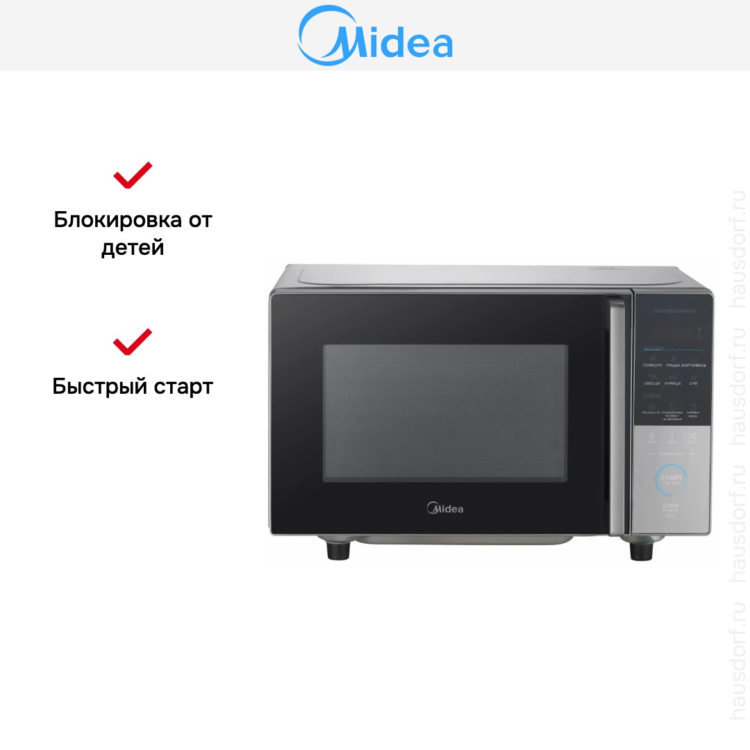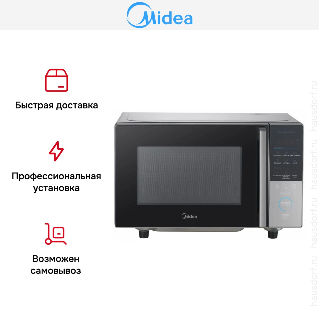 Отдельностоящая микроволновая печь Midea EM720CFR-BG — компактное и полезное дополнение к уже имеющейся кухонной технике. Ее можно установить на шкаф, на свободную столешницу, но не рекомендуется ставить на другие приборы, например, холодильник. Цвет этой модели: серебристый.