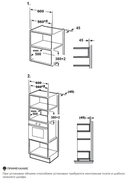 Высота микроволновой печи, то есть расстояние от основания до крышки прибора, определяется прежде всего типом встраивания. Отдельно стоящие модели — как соло, так и оснащенные грилем или конвекцией, — с камерой объемом от 15 до 30 литров, имеют высоту около 30 см. Такие микроволновки удобно размещаются на столе; при необходимости их можно убрать на полку или в шкаф. Встраиваемые в стандартную кухонную колонну или тумбу многофункциональные микроволновые печи имеют ту же высоту, что и другая встроенная техника: для компактных приборов она составляет 45 см, а для полноразмерных — порядка 60 см.