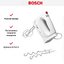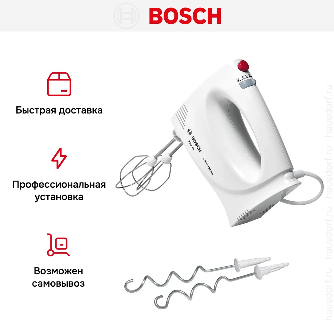 Обратите внимание на цвет миксера Бош — белый — он может стать как гармоничным дополнением кухонной обстановки, так и ярким акцентом. В комплекте с самим прибором идут дополнительные элементы: венчик для взбивания, крюки для теста.