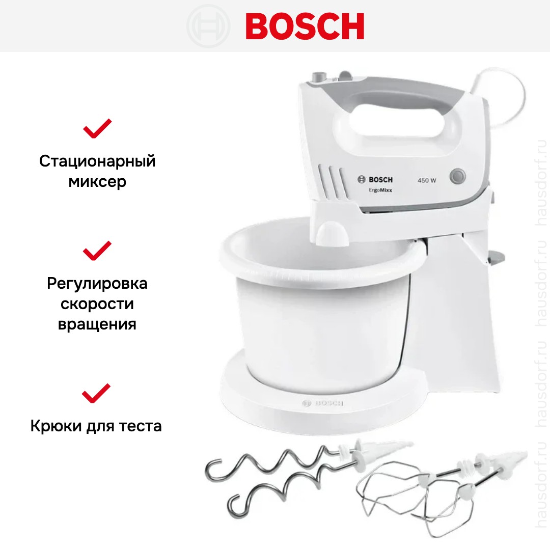 Миксер Bosch MFQ 36460 — это стационарная кухонная техника, созданная для тех, кто стремится к удобству, надёжности и высокой производительности в процессе готовки. Белоснежный корпус из прочного пластика придаёт устройству лёгкость и современный облик, гармонично вписываясь в интерьер любой кухни. Модель оснащена вместительной чашей объёмом 3 литра, также выполненной из качественного полимерного материала, что обеспечивает безопасность, долговечность и простоту ухода.