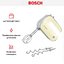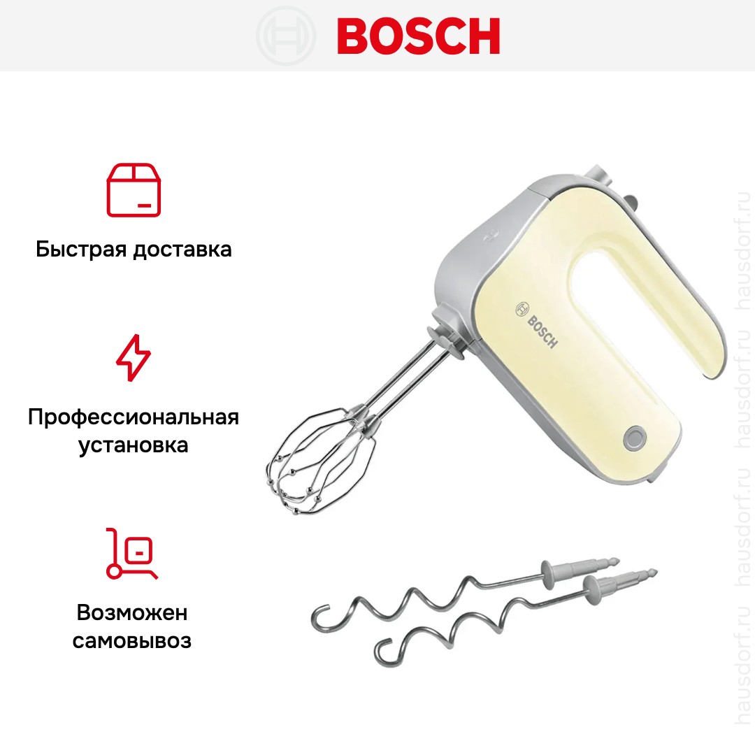 Обратите внимание на цвет миксера Бош — бежевый — он может стать как гармоничным дополнением кухонной обстановки, так и ярким акцентом. В комплекте с самим прибором идут дополнительные элементы: венчик для взбивания, крюки для теста.