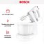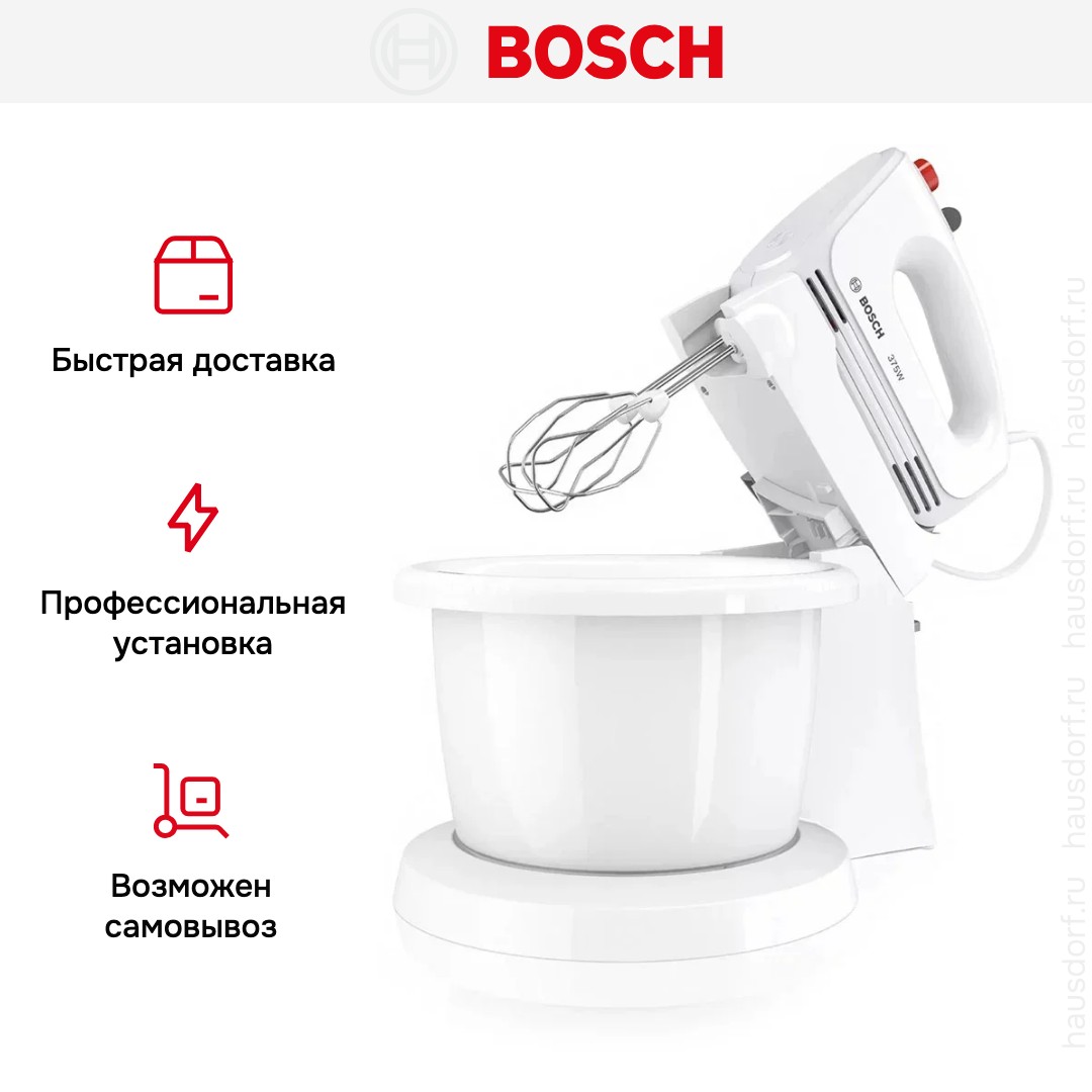 Обратите внимание на цвет миксера Бош — белый — он может стать как гармоничным дополнением кухонной обстановки, так и ярким акцентом. В комплекте с самим прибором идут дополнительные элементы: венчик для взбивания, крюки для теста.