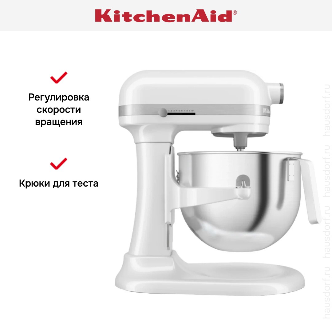 Стационарный миксер KitchenAid Heavy Duty сочетает классический силуэт и продуманные инженерные решения. Его белый корпус из металла выглядит сдержанно и современно, поэтому прибор органично впишется в любую кухонную зону. Металлическая отделка не только придаёт эстетическую завершённость, но и обеспечивает долговечность корпуса при ежедневной эксплуатации. Компактные габариты и солидный вес делают конструкцию устойчивой во время интенсивной работы и минимизируют вибрации.