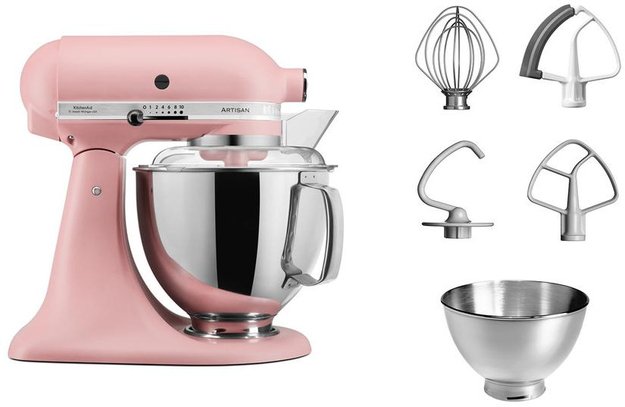 Обратите внимание на цвет миксера Китчен Эйд — сухая роза — он может стать как гармоничным дополнением кухонной обстановки, так и ярким акцентом. В комплекте с самим прибором идут дополнительные элементы: венчик для взбивания, крюки для теста, насадка-лопатка для перемешивания, защитный обод, стальная чаша объемом 3 л, лопатка с гибким ребром.