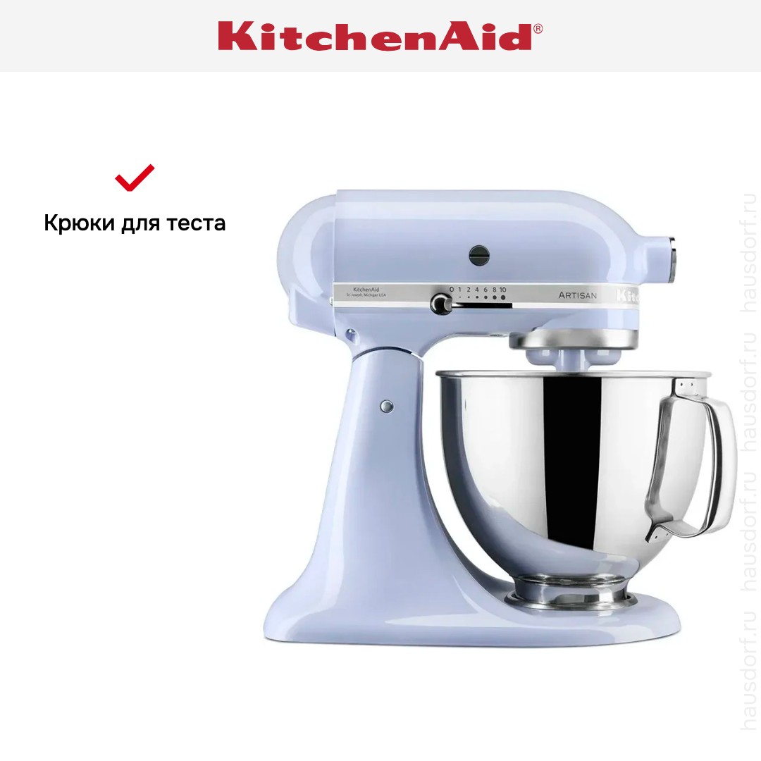 Обратите внимание на цвет миксера Китчен Эйд — фиолетовый — он может стать как гармоничным дополнением кухонной обстановки, так и ярким акцентом. В комплекте с самим прибором идут дополнительные элементы: венчик для взбивания, крюки для теста, лопатка с гибким ребром.