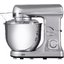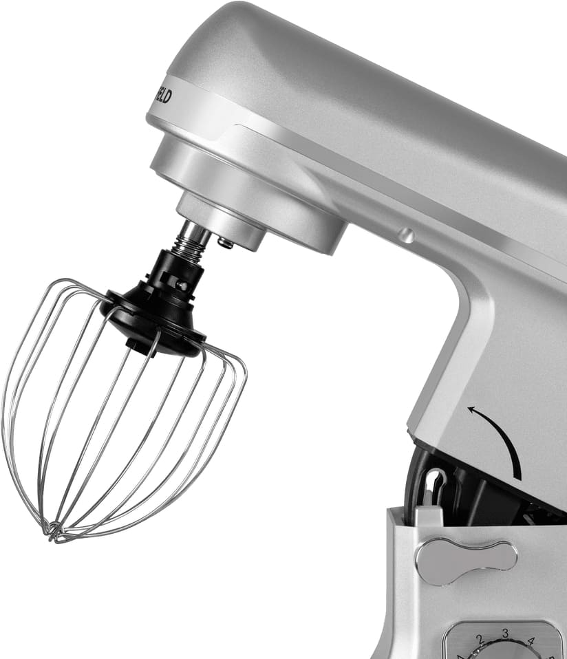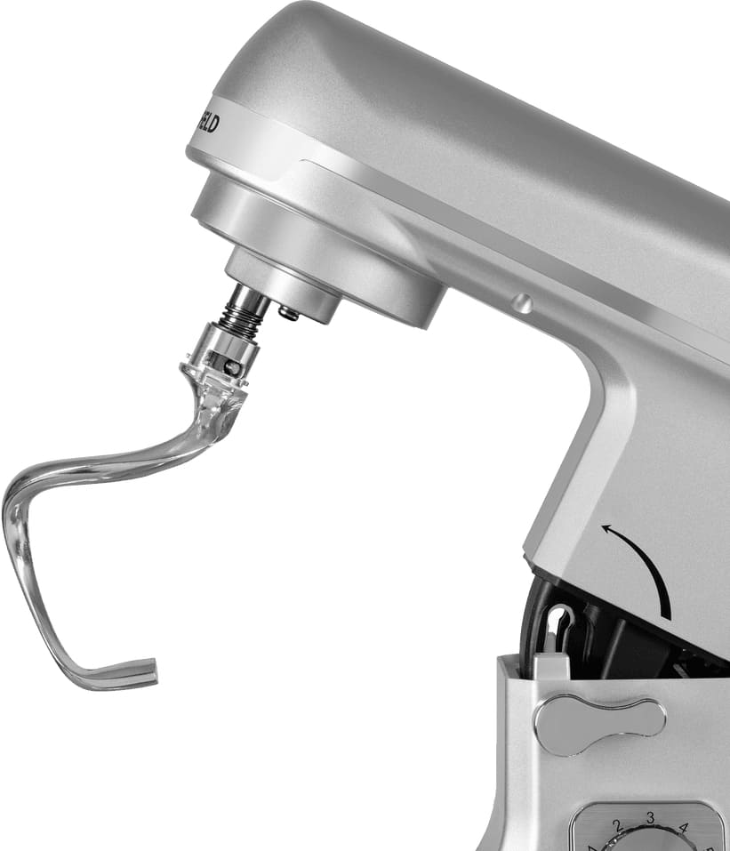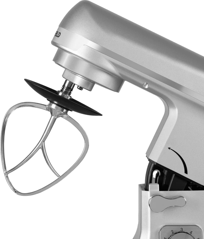 Обратите внимание на цвет миксера Маунфилд — нержавеющая сталь — он может стать как гармоничным дополнением кухонной обстановки, так и ярким акцентом. В комплекте с самим прибором идут дополнительные элементы: венчик для взбивания, защитный обод с воронкой для засыпания продуктов, крюки для теста, насадка-лопатка для перемешивания.
