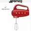 Ручной миксер Smeg HMF01RDEU входит в коллекцию в стиле 50-х годов и привлекает внимание благодаря корпусу ярко-красного цвета с хромированной отделкой. Его вес составляет всего 1,15 кг, а мощность достигает 250 Вт: этого достаточно для замешивания густого теста, взбивания масла и белков, приготовления соусов и кремов. 6 насадок из нержавеющей стали и 9 скоростей вращения позволяют справиться со смешиванием продуктов любой плотности. Система плавного пуска увеличивает надежность работы миксера Смег HMF01RDEU.