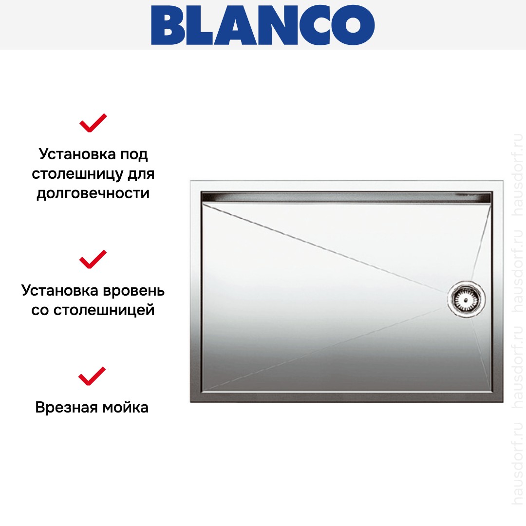 Врезная мойка Blanco — отличный выбор для тех, кто хочет создать гармоничное кухонное пространство с полностью вписывающейся в него сантехникой. Преимущество такой конструкции — плотное прилегание к столешнице, так как вырез подбирается индивидуально под габариты модели. Под стыки не попадает вода, поэтому срок службы значительно увеличивается, пользоваться ей удобно и приятно. Устанавливается вровень со столешницей, благодаря чему не остается стыков, в которых копились бы загрязнения.