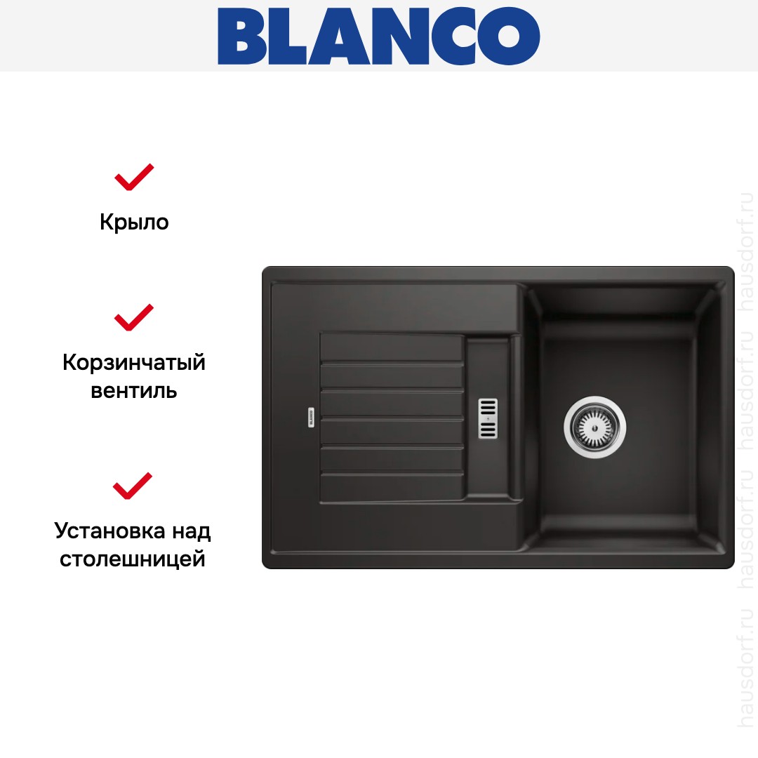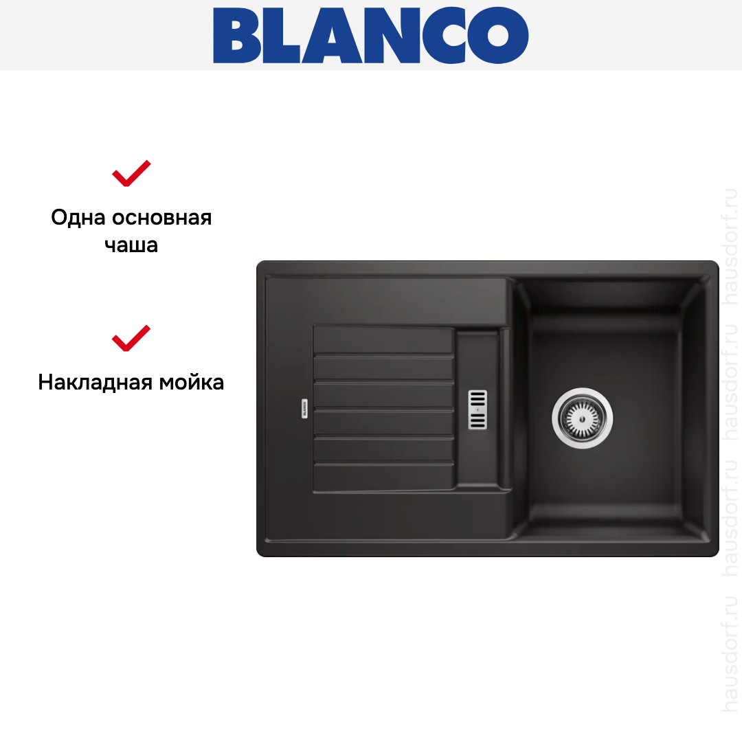 Накладная мойка Blanco — отличный выбор для тех, кто хочет создать гармоничное пространство с удобной сантехникой. простой в установке. Преимущество такой конструкции: легко подобрать практически к любой кухне и не придется демонтировать вместе с тумбой при ремонте или перестановке остальной мебели. Данная модель имеет стандартную форму, поэтому подходит большинству пользователей. Устанавливается над столешницей: это самый простой способ монтажа, зачастую с ним можно справиться даже без специалистов, главное — правильно рассчитать размеры ниши.