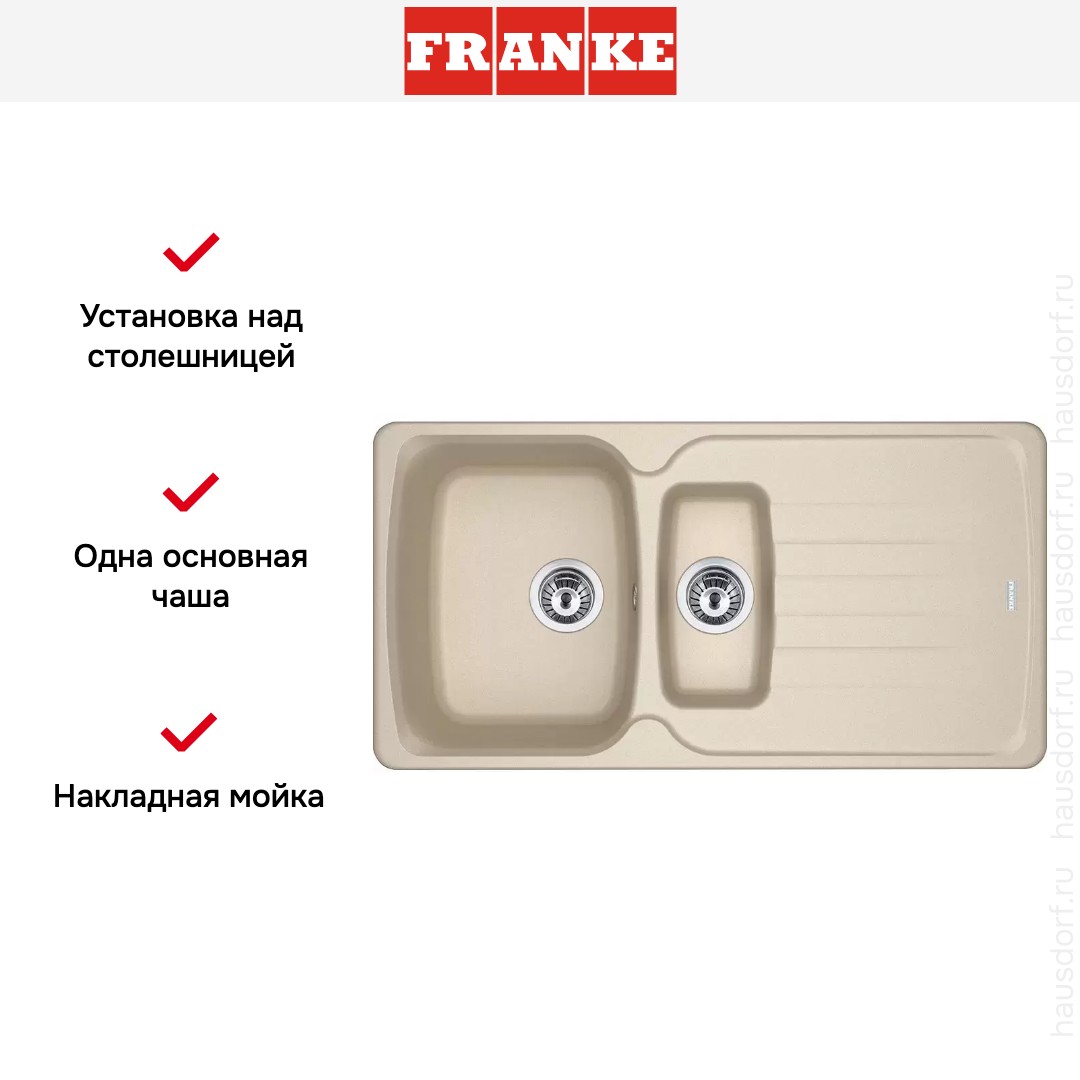 Накладная мойка Franke — отличный выбор для тех, кто хочет создать гармоничное пространство с удобной сантехникой. простой в установке. Преимущество такой конструкции: легко подобрать практически к любой кухне и не придется демонтировать вместе с тумбой при ремонте или перестановке остальной мебели. Данная модель имеет стандартную форму, поэтому подходит большинству пользователей. Устанавливается над столешницей: это самый простой способ монтажа, зачастую с ним можно справиться даже без специалистов, главное — правильно рассчитать размеры ниши.