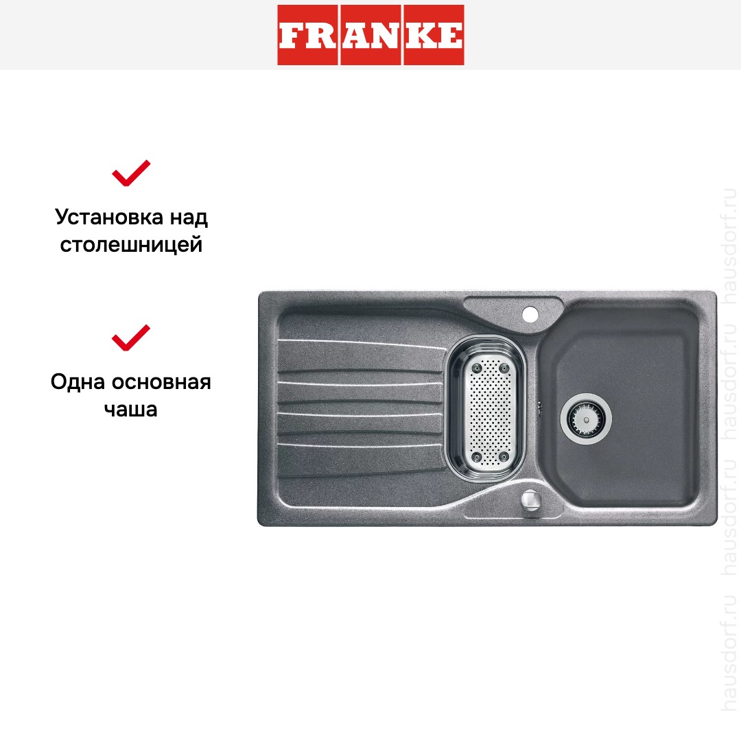 Накладная мойка Franke — отличный выбор для тех, кто хочет создать гармоничное пространство с удобной сантехникой. простой в установке. Преимущество такой конструкции: легко подобрать практически к любой кухне и не придется демонтировать вместе с тумбой при ремонте или перестановке остальной мебели. Данная модель имеет стандартную форму, поэтому подходит большинству пользователей. Устанавливается над столешницей: это самый простой способ монтажа, зачастую с ним можно справиться даже без специалистов, главное — правильно рассчитать размеры ниши.