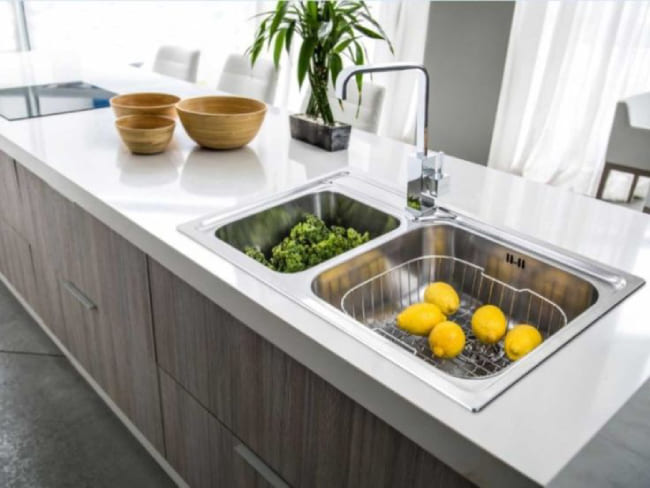 вровень со столешницей — создается ощущение бесшовного пространства, а если мойка сделана из того же материала, то и единого дизайна;