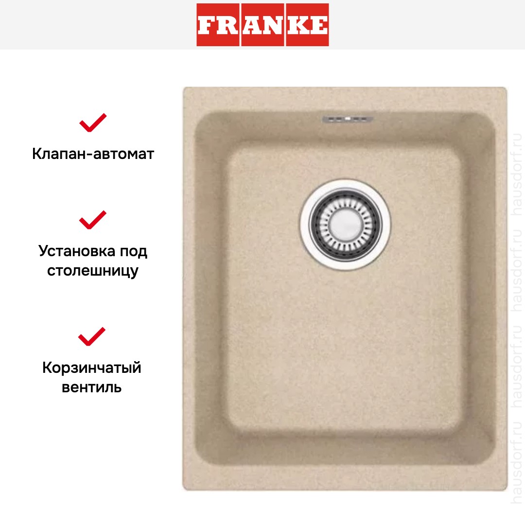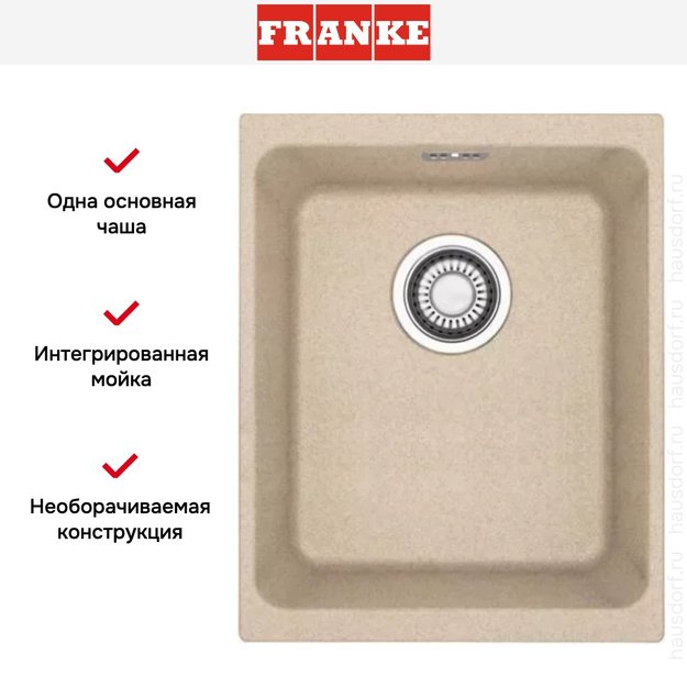 Обратите внимание на дизайнерские отличия мойки Франке, которые помогут в создании идеальной кухни в вашем доме. Она выполнена в цвете бежевый. Основной материал — фрагранит, он гарантирует надежность и долгие годы службы без повреждений.