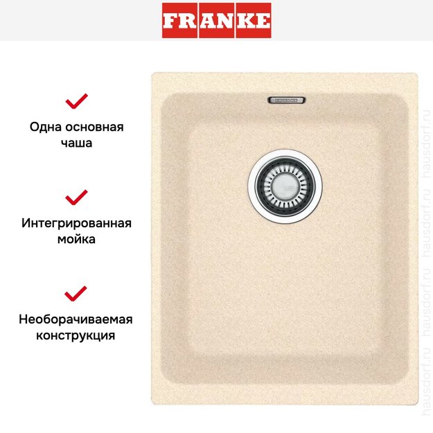 Обратите внимание на дизайнерские отличия мойки Франке, которые помогут в создании идеальной кухни в вашем доме. Она выполнена в цвете ваниль. Основной материал — фрагранит, он гарантирует надежность и долгие годы службы без повреждений.
