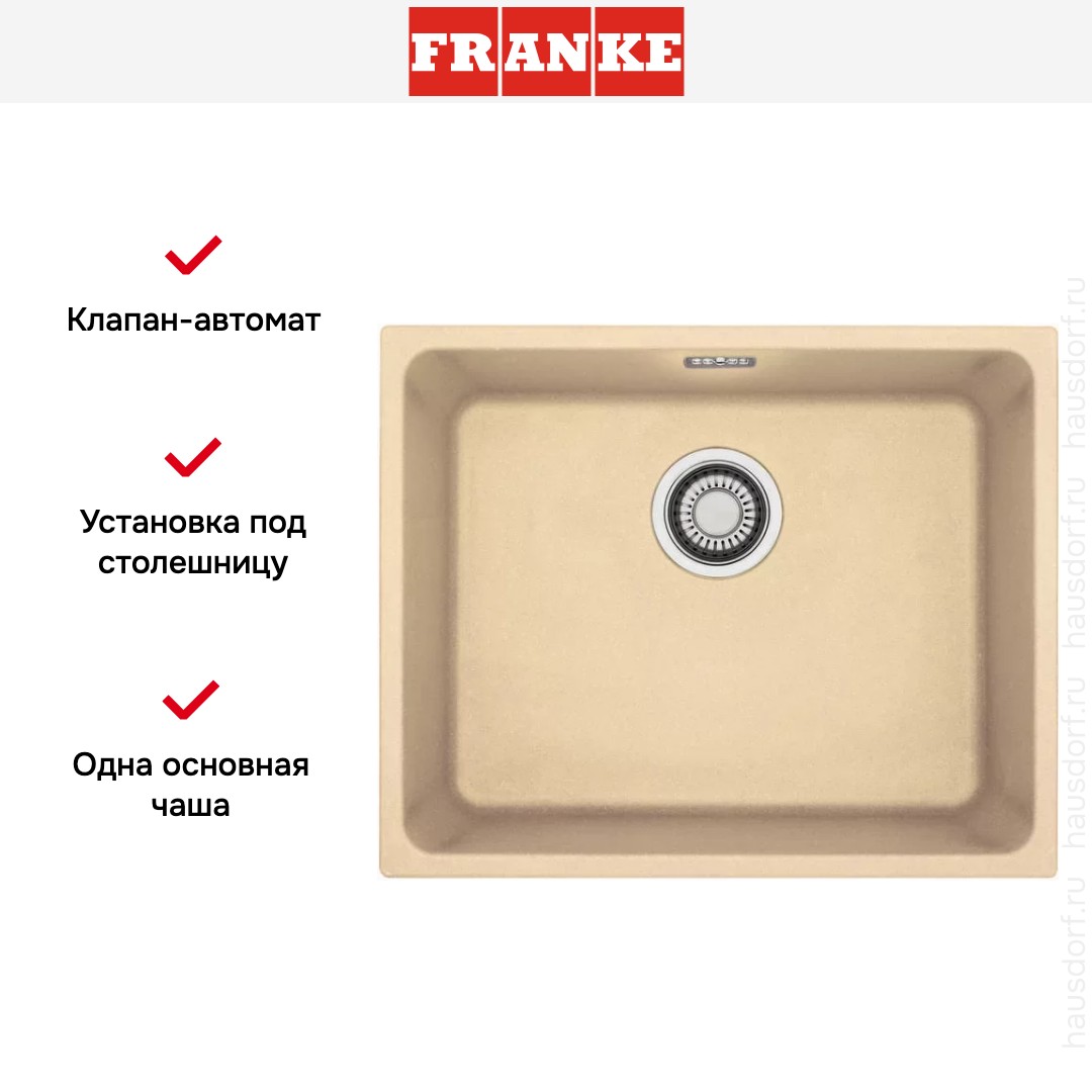 Обратите внимание на дизайнерские отличия мойки Франке, которые помогут в создании идеальной кухни в вашем доме. Она выполнена в цвете сахара. Основной материал — фрагранит, он гарантирует надежность и долгие годы службы без повреждений.
