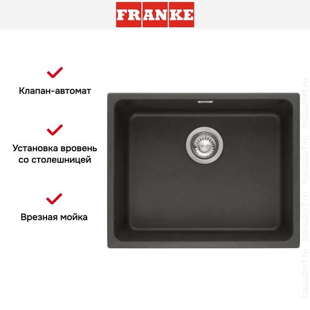 Врезная мойка Franke — отличный выбор для тех, кто хочет создать гармоничное кухонное пространство с полностью вписывающейся в него сантехникой. Преимущество такой конструкции — плотное прилегание к столешнице, так как вырез подбирается индивидуально под габариты модели. Под стыки не попадает вода, поэтому срок службы значительно увеличивается, пользоваться ей удобно и приятно. Данная модель имеет стандартную форму, поэтому подходит большинству пользователей. Устанавливается вровень со столешницей, благодаря чему не остается стыков, в которых копились бы загрязнения. Устанавливается над столешницей: это самый простой способ монтажа, зачастую с ним можно справиться даже без специалистов, главное — правильно рассчитать размеры ниши.