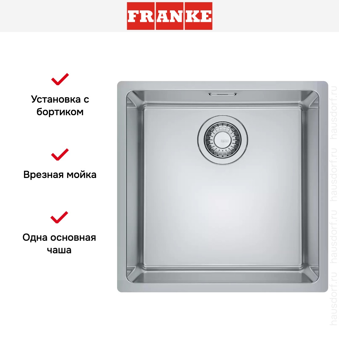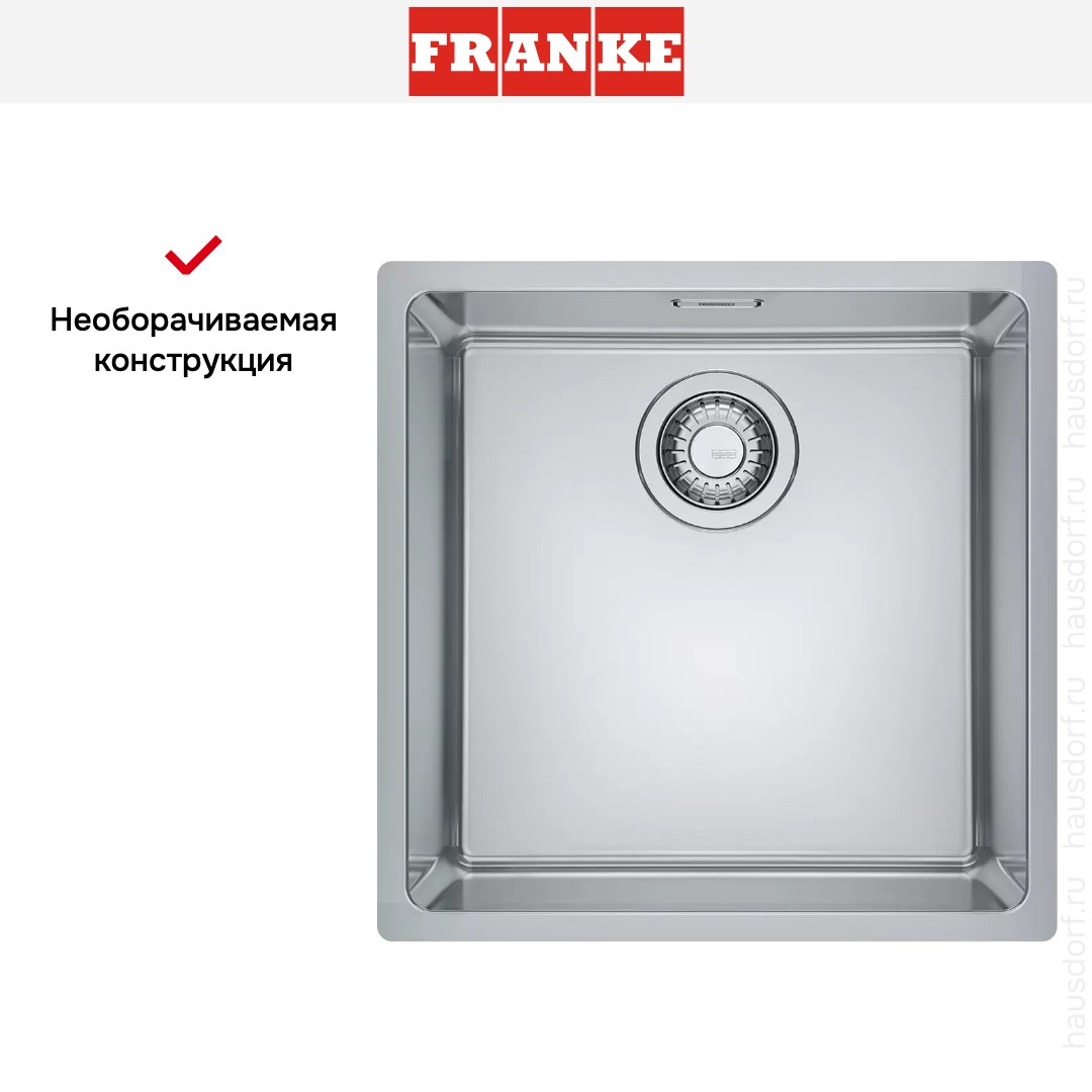 Мойка Franke Maris MRX 210-40 выглядит лаконично и собранно: квадрат 44×44 см с прямолинейным контуром и плоским кантом SlimTop. Прямоугольная форма подчеркнута небольшими скруглениями 1 и 1.6 см. Цвет — нержавеющая сталь: нейтральный металлический оттенок сочетается с техникой и фурнитурой. Поверхность не перетягивает внимание. Формат врезной с установкой с бортиком: тонкая кромка создаёт ровный переход со столешницей. Плоский кант SlimTop образует деликатную рамку вокруг чаши.