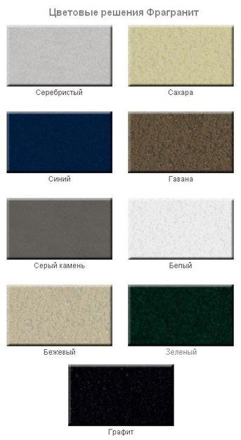Мойки из искусственного камня выпускаются обычно в пастельных тонах, которые получают благодаря добавлению специальных пигментов. Количество оттенков у них очень велико — от белого, жемчужного, беж, цветов ванили, пастилы, корицы до тонов графит, антрацит и базальт, а также универсального черного. Эти оттенки отличаются высокой стойкостью, не линяют и не выцветают. Менее востребованы цветные мойки, однако по качеству они не уступают изделиям нейтральных оттенков.