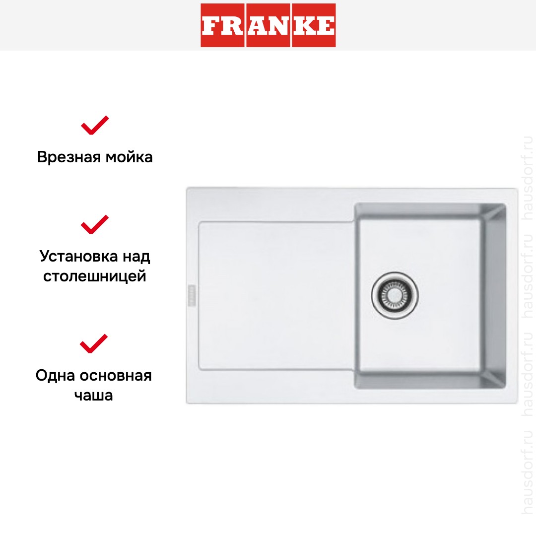 Обратите внимание на дизайнерские отличия мойки Франке, которые помогут в создании идеальной кухни в вашем доме. Она выполнена в цвете белый. Основной материал — гранит, он гарантирует надежность и долгие годы службы без повреждений. Крыло, расположенное слева или справа, является дополнительным рабочим пространством, на котором можно сушить посуду, разделывать мясо и нарезать овощи.
