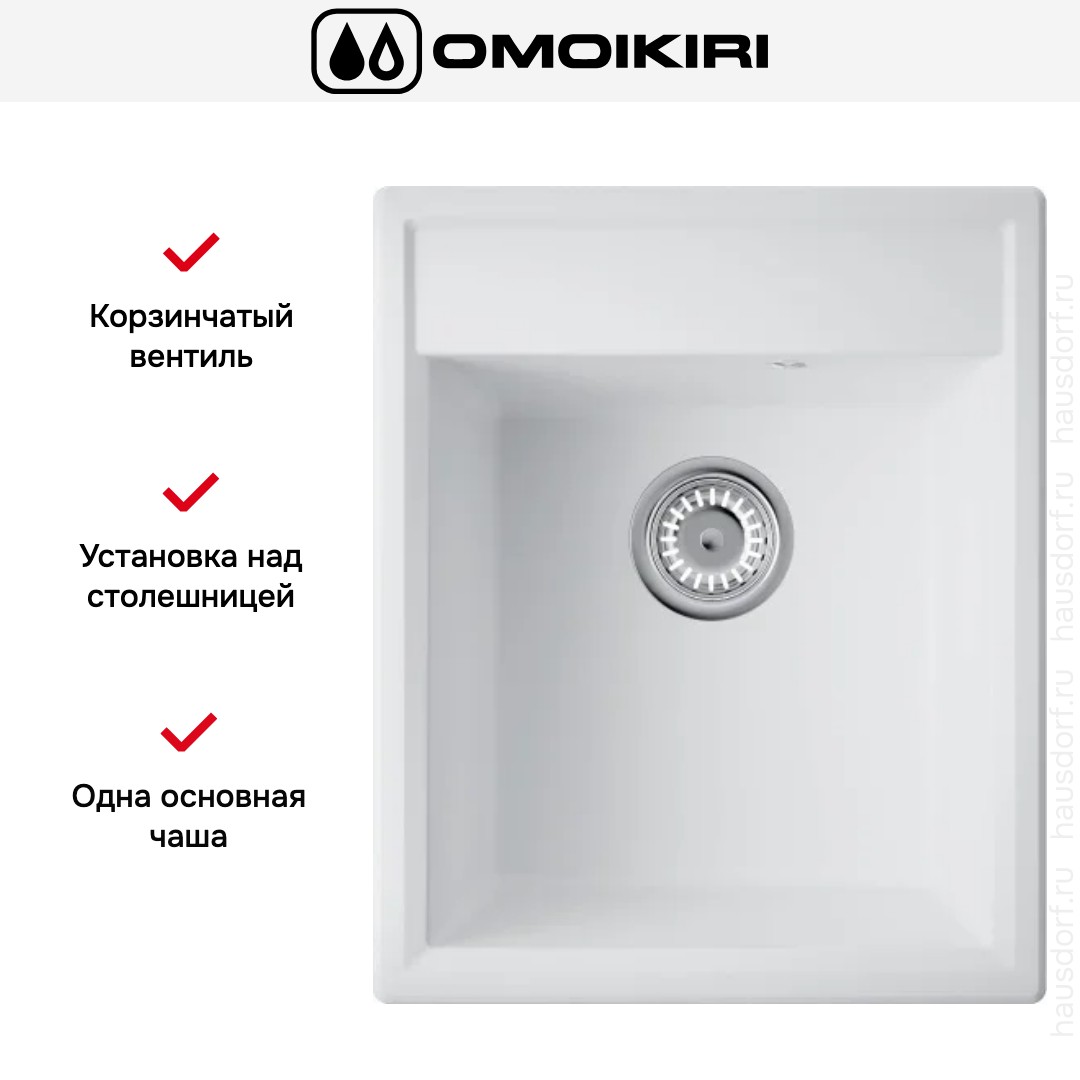 Материал композитный на основе натурального камня — ArtGranit, который прост в очистке, не подвержен воздействиям высоких температур, не царапается и сохраняет первоначальный оттенок. Заготовка формируется методом литья, толщина стенок достигает 10 мм. Такое исполнение производит впечатление монолитности и уверенной посадки на столешницу. Масса 4,5 кг удобна для переноски и монтажа, при этом изделие ощущается основательным. Однотонная палитра белого цвета поддерживает визуальную целостность гарнитура.