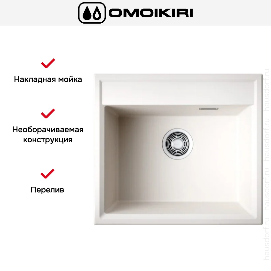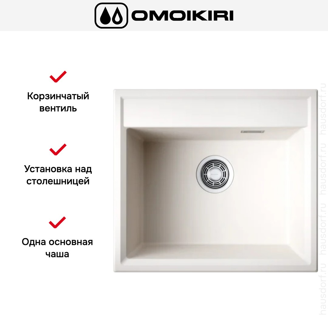 Мойка Omoikiri Daisen 57-PA — накладная квадратная модель пастильного цвета с габаритами 57×51 см, рассчитанная для установки над столешницей. Компактные внешние размеры делают её удобной для кухонь с ограниченным пространством, при этом сохраняется вместительность основной чаши. Небольшая ширина базы 60 см обеспечивает совместимость с типовыми тумбами, а монтажное отверстие 55,4×49,4 см облегчает подготовку рабочей поверхности.