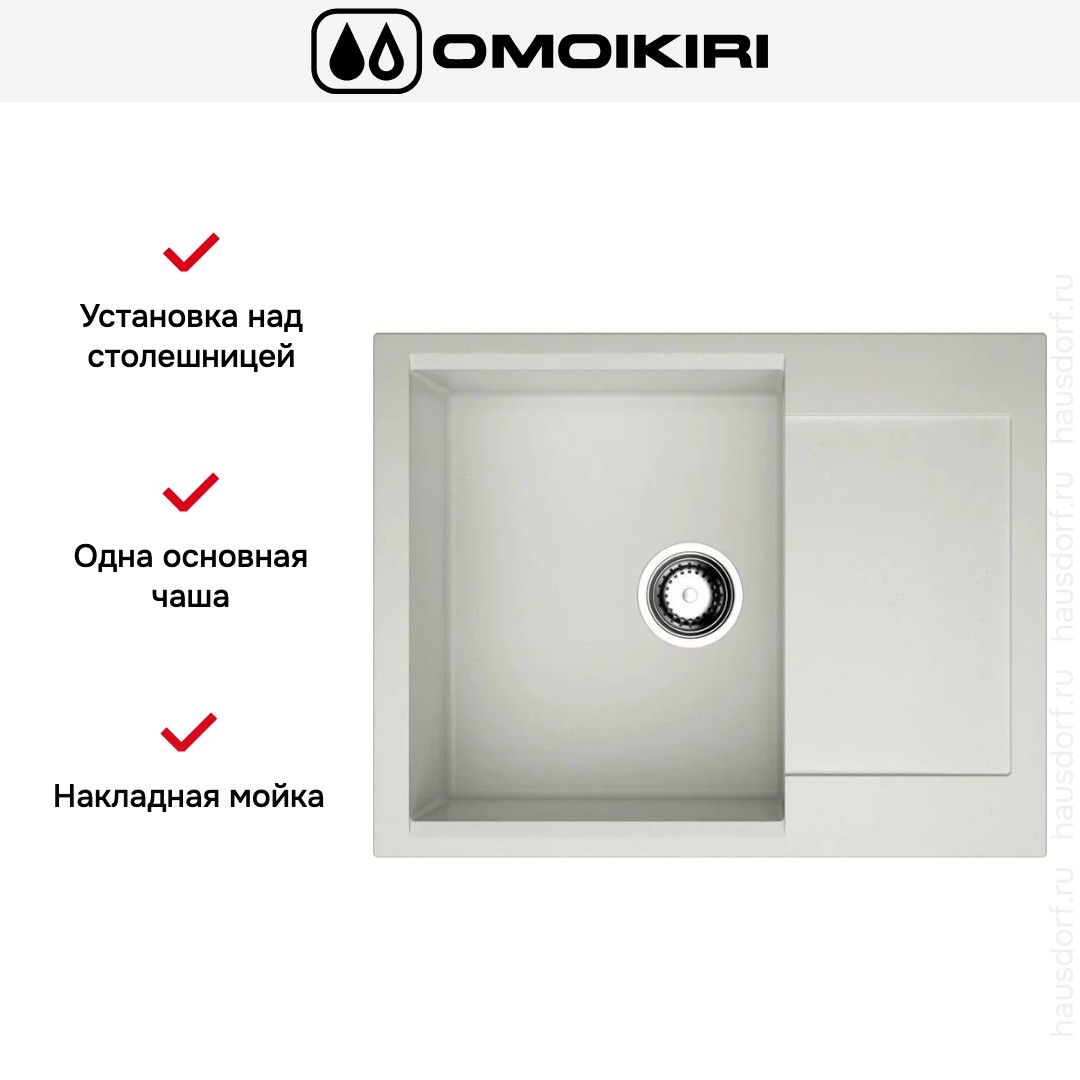 Накладная мойка Omoikiri — отличный выбор для тех, кто хочет создать гармоничное пространство с удобной сантехникой. простой в установке. Преимущество такой конструкции: легко подобрать практически к любой кухне и не придется демонтировать вместе с тумбой при ремонте или перестановке остальной мебели. Данная модель имеет стандартную форму, поэтому подходит большинству пользователей. Устанавливается над столешницей: это самый простой способ монтажа, зачастую с ним можно справиться даже без специалистов, главное — правильно рассчитать размеры ниши.
