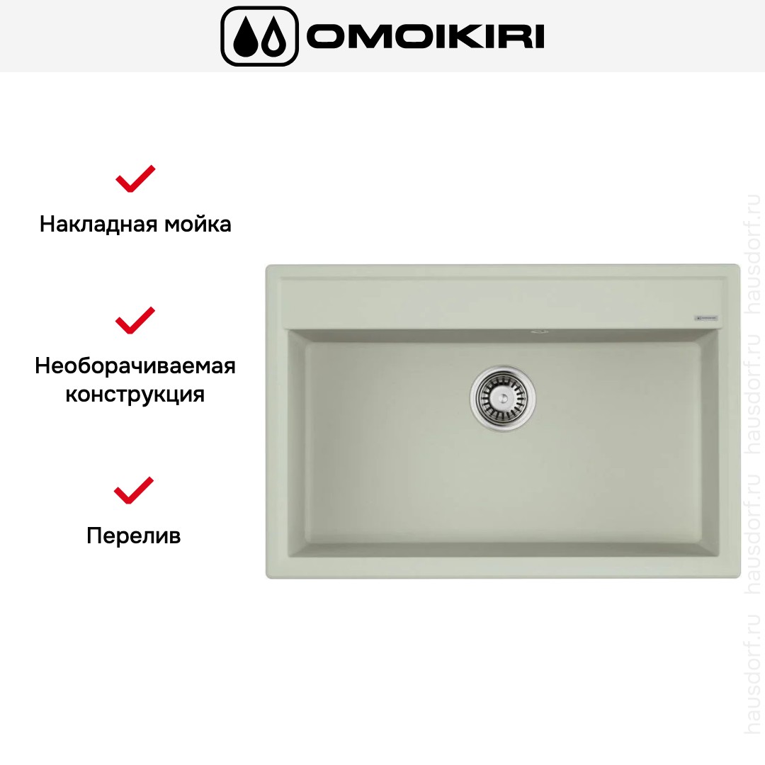 Накладная мойка Omoikiri — отличный выбор для тех, кто хочет создать гармоничное пространство с удобной сантехникой. простой в установке. Преимущество такой конструкции: легко подобрать практически к любой кухне и не придется демонтировать вместе с тумбой при ремонте или перестановке остальной мебели. Данная модель имеет стандартную форму, поэтому подходит большинству пользователей. Устанавливается над столешницей: это самый простой способ монтажа, зачастую с ним можно справиться даже без специалистов, главное — правильно рассчитать размеры ниши.