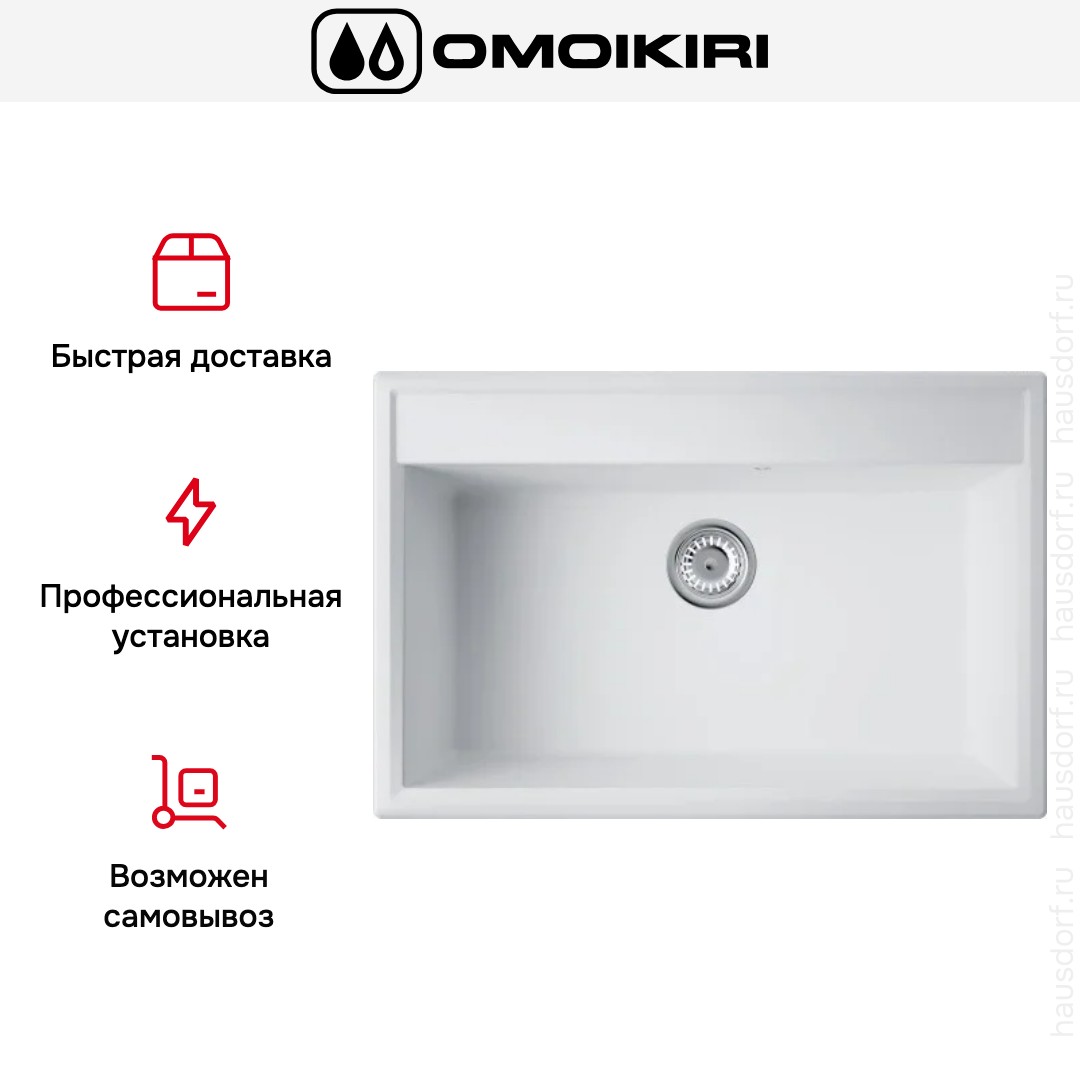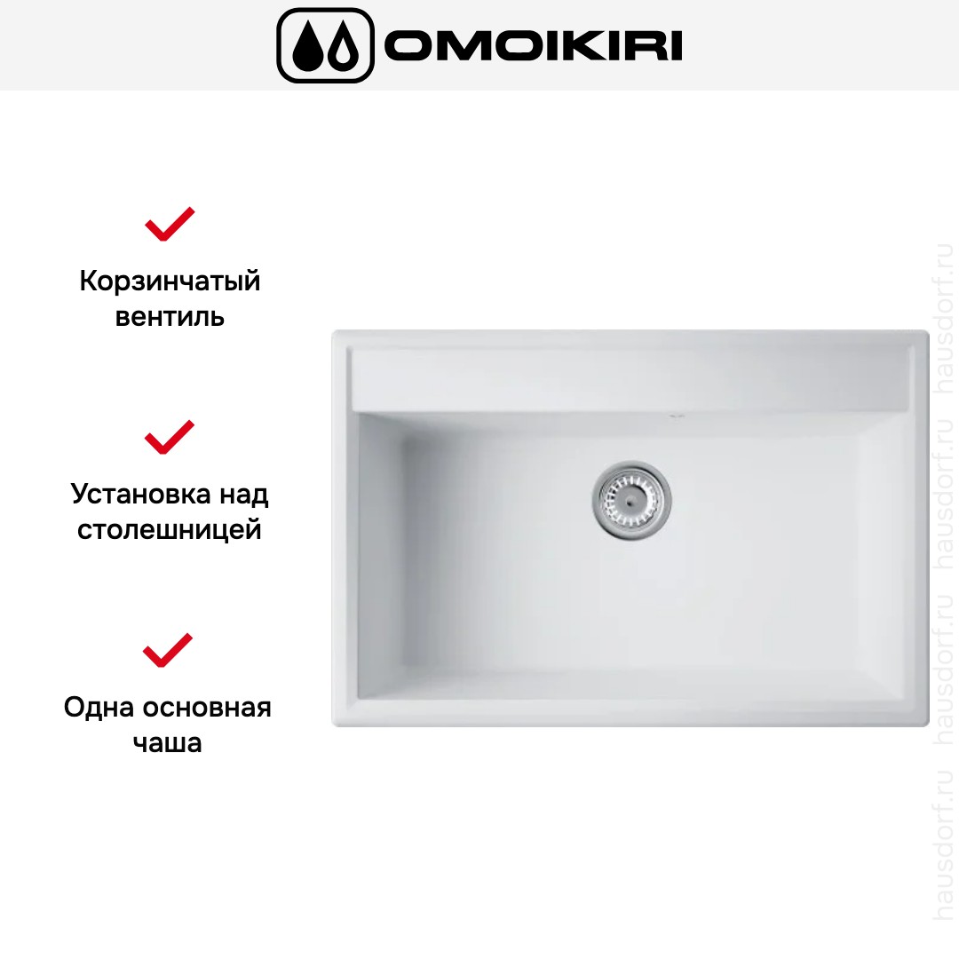 Выглядит лаконично и уверенно: прямоугольная геометрия с четкими линиями, белого цвета, с пропорциями 77×51 см. Плоскости ровные, контуры строгие, модель органично занимает свое место на рабочей поверхности и не перегружает ее визуально. Неширокая площадка в задней части может использоваться для размещения губок и моющих средств.