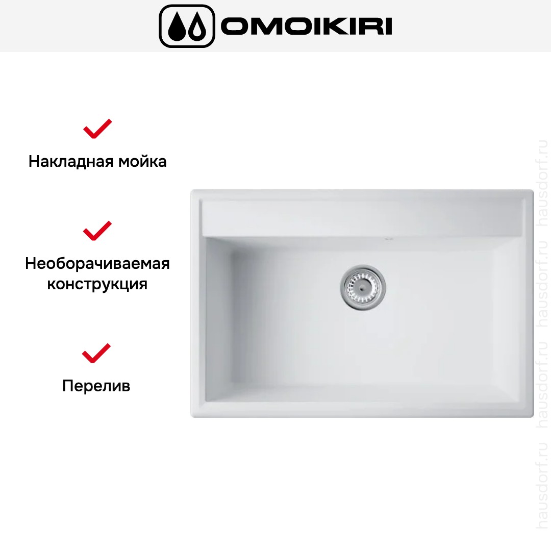 Это накладной вариант, устанавливаемый над столешницей. Для монтажа требуется база шириной 80 см и вырез 75×49 см — эти размеры позволяют заранее точно подготовить посадочное место. Конструкция не оборачиваемая, ориентация фиксированная и не предполагает зеркальную установку.