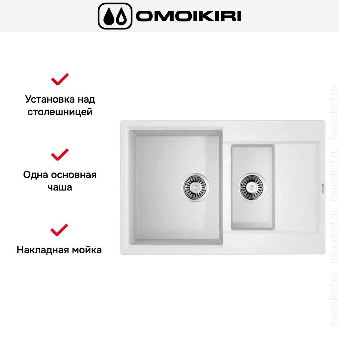 Накладная мойка Omoikiri — отличный выбор для тех, кто хочет создать гармоничное пространство с удобной сантехникой. простой в установке. Преимущество такой конструкции: легко подобрать практически к любой кухне и не придется демонтировать вместе с тумбой при ремонте или перестановке остальной мебели. Данная модель имеет стандартную форму, поэтому подходит большинству пользователей. Устанавливается над столешницей: это самый простой способ монтажа, зачастую с ним можно справиться даже без специалистов, главное — правильно рассчитать размеры ниши.