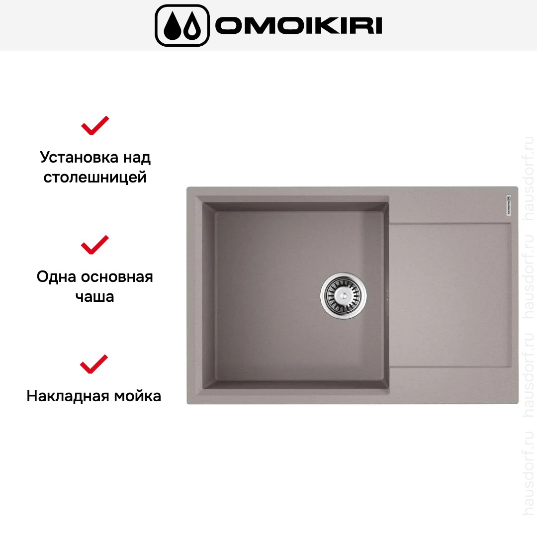 Накладная мойка Omoikiri — отличный выбор для тех, кто хочет создать гармоничное пространство с удобной сантехникой. простой в установке. Преимущество такой конструкции: легко подобрать практически к любой кухне и не придется демонтировать вместе с тумбой при ремонте или перестановке остальной мебели. Данная модель имеет стандартную форму, поэтому подходит большинству пользователей. Устанавливается над столешницей: это самый простой способ монтажа, зачастую с ним можно справиться даже без специалистов, главное — правильно рассчитать размеры ниши.