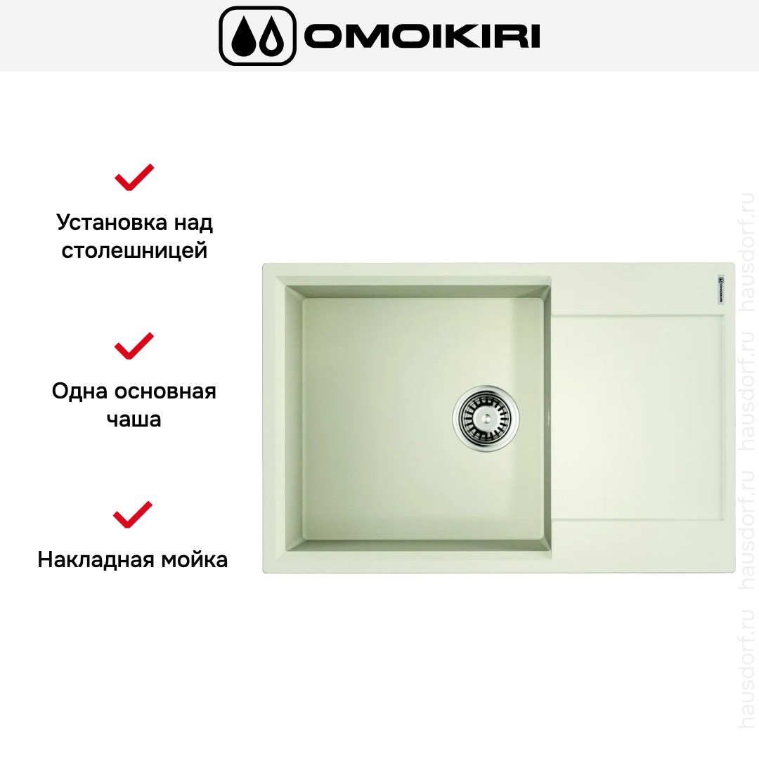 Накладная мойка Omoikiri — отличный выбор для тех, кто хочет создать гармоничное пространство с удобной сантехникой. простой в установке. Преимущество такой конструкции: легко подобрать практически к любой кухне и не придется демонтировать вместе с тумбой при ремонте или перестановке остальной мебели. Данная модель имеет стандартную форму, поэтому подходит большинству пользователей. Устанавливается над столешницей: это самый простой способ монтажа, зачастую с ним можно справиться даже без специалистов, главное — правильно рассчитать размеры ниши.
